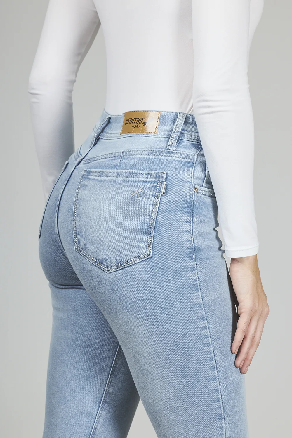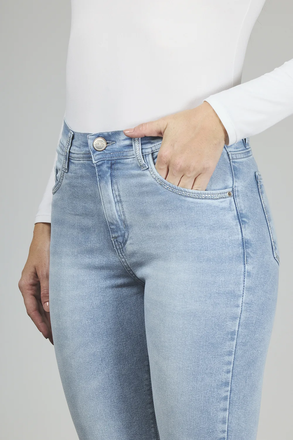 ART. 351 | CLASICO CELESTE CON STRASS EN BOLSILLO Y PASA CINTO ELASTIZADO